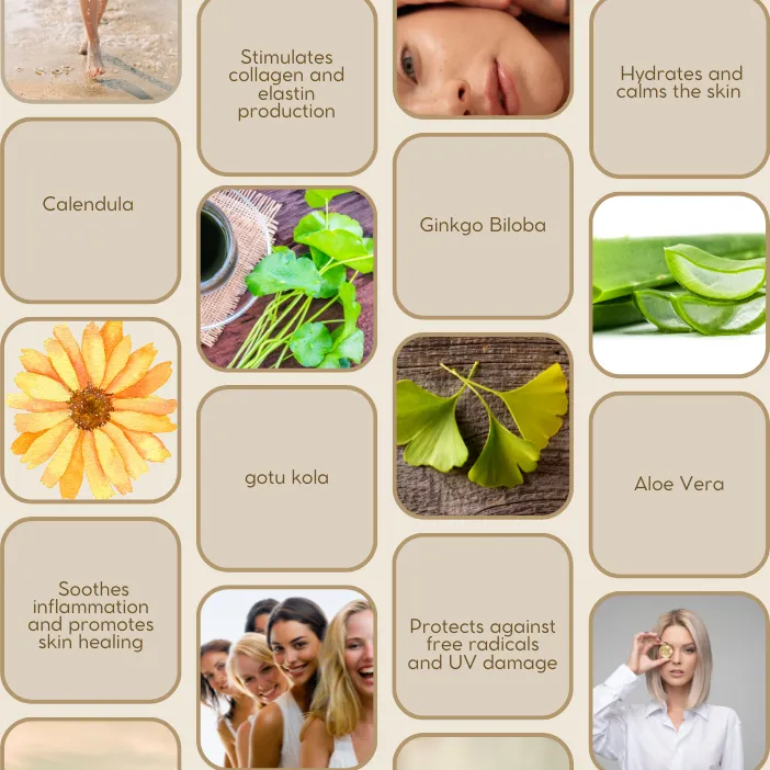 🔸ส่วนผสมจากธรรมชาติ: สารสกัดจากดอกดาวเรือง ใบบัวบก ใบแปะก๊วย และอื่นๆ